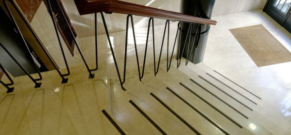 La obra afecta al desarrollo de la escalera que se modifica y adapta manteniendo su aspecto sobrio y elegante en consonancia con el edificio.